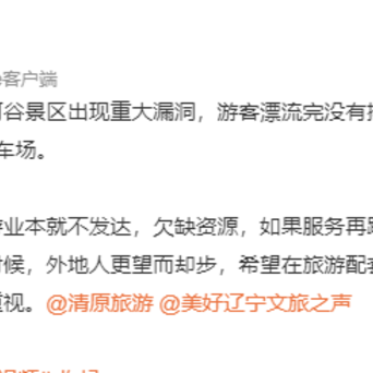 多个网友发帖表达对景区的不满,@京城数码爷称,“3日,辽宁抚顺红河谷景区出现重大漏洞,游客漂流完没有摆渡车接送,据称,有上万人徒步5公里前往停车场。咱就说,东北的旅游业本就不发达,欠缺资源,如果服务再跟不上怎么来吸引游客?当本地人都不认可的时候,外地人更望而却步,希望在旅游配套设施建设和统筹规划方面能够得到相关部门重视。”