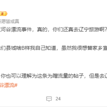 @刘成春称,“刷抖音刷到了红河谷漂流事件,真的,你们还真去辽宁旅游啊?不说其他的,我们县城啥样我自己知道,虽然我很想替家乡宣传,但是让哥们骗人那事我干不了!所以我不宣传,你也可以理解为这条为蹭流量的帖子,但是去辽宁旅游,我不推荐!”
