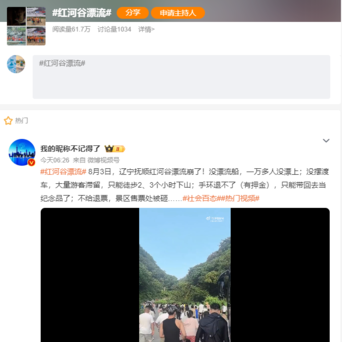 【摆渡车停摆、大量游客滞留,辽宁红河谷漂流惹众怒】8月3日,辽宁抚顺,网友@我的昵称不记得了反映,红河谷景区漂流崩了!没漂流船,一万多人没漂上;没摆渡车,大量游客滞留,只能徒步2、3个小时下山;手环退不了(有押金),只能带回去当纪念品了;不给退票,景区售票处被砸……
